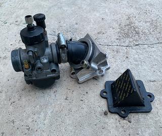 - Aspirazione minarelli orizzontale composta da basetta artigianale in alluminio, collettore Polini, pacco lamellare malossi VL14 e carburatore dell’orto 19 aria manuale senza servizi - 120 €