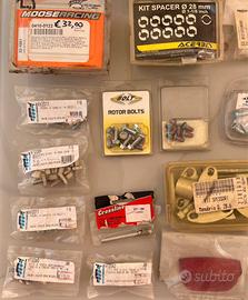 Vendo vari ricambi e accessori per moto cross, enduro e motard, nuovi e usati.Vendo anche singolarmente. Sono disponibili i seguenti articoli: rubinetto destro per serbatoio Acerbis €10, puntale pedana freno posteriore verde per moto sportive €10, supporti paramani chiusi Acerbis/Hebo €5, kit di montaggio paramani MX Uniko Vented €8, kit anelli manubrio diametro 28 (2 set, 10 pezzi) €20, copri leva frizione in gomma KX 60/65/80/85 €10. Disponibile kit cuscinetti sterzo Moose Racing per modelli Husqvarna dal 1999 al 2013 (CR, TC, TE, TXC, WR, SM, SMS, SMR) codice 001001‑02.Presenti anche fermi a gancio €3, registri leve diametro 8 mm €3, viti a testa semibombata M6x13 mm €1, viti corona Yamaha YZ/YZF/WR €5, viti corona Yamaha 2009 YRTR €5, perno pastiglie freno posteriore €5, kit spessori manubrio diametro 28.6. Disponibili inoltre lente fanale posteriore KTM GS/EXC anni 80, wash cap set KTM 81212016000 €10, paraspruzzi KTM 54606010000 €10, distanziali per mascherina €5, protezioni pedaline in gomma €5, paracolpi manubrio arancione €5, pellicola blu oscurante fari moto €2, tubo silicone arancione 1 metro €4, toppe pantaloni UFO €5.