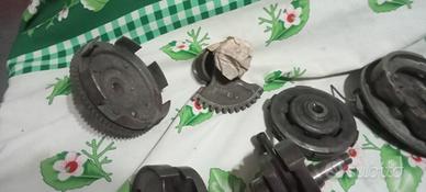 un 'albero motore originale un 'altro anticipato come da foto campana pignone e frizione ingranaggio messa in moto con molla portaganasce collettore più bocchettone originale 2 griglie volano una cuffia cilindro un portaoggetti tutto in stock per sgombero