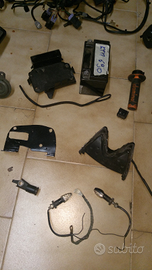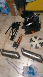 disponibile batteria,forcellone,telaietto,cerchio posteriore,dischi freno,pompa e pinza posteriore,mono,scarichi silenziatori,catena,riser,serbatoio con chiave,leveraggi ,impiento elettrico,bobina,centralina,specchietti,frecce,cavalletto,pedale freno,manopole,clacson,blocchetti luci,devioluci, stop post,ecc.