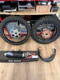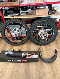 Cerchi completi 18-21, volendo completi di mousse e pneumatici metzeler 90/90 standard e 140/80 soft -Paramarmitta carbonio per espansione TBI 250/300 -Silenziatore OXA per 250/300 seminuovo 2h di uso - Riser manubrio altezza standard Prezzi da concordare