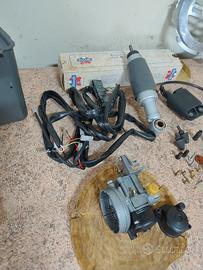 come da titolo vendo: pneumatici marca Pirelli usati pochissimo 25 euro.Leve originale con fermi 10 euro.Ammortizatore anteriore originale 20euro.Carburatore 16.10 originale con 2 vaschette 20euro.Cablaggio elettrico nuovo 30euro.Bobbina nuova 20euro. minuteria varie:getti varie misure, guarnizione per rubinetto, tacchetti per cavalletto,spillo per vaschetta, cilindretto per accensione, guarnizione per collettore scarico,etc etc tutto in foto 15 euro.Filo freno posteriore nuovo 10 euro.Coprivolano originale 10 euro.Porta attrezzi originale 10euro.