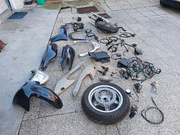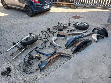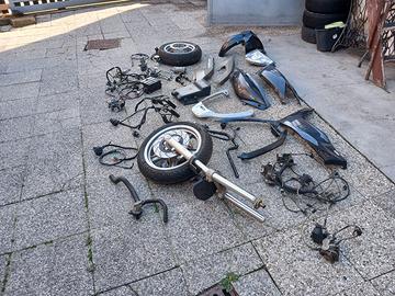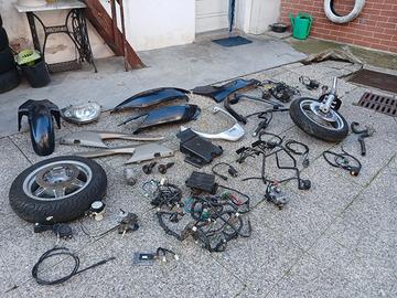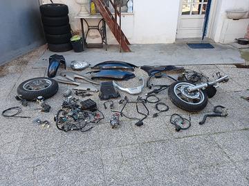 vendesi : parafango anteriore ,fanale anteriore, plastiche fianchetti dx e sx, ruote complete di disco freni ant e post, attacco maniglione attacco porta bauletto, manubrio completo, circuiti freni completi, motorino avviamento , blocchetto avviamento con chiave e tappo serbatoio, carburatore, bobina candela, cavo completo x freno a mano, circuito elettrico completo alberi a camme, blocchetto tensione, cavo completo x apertura sella, cavi x freni. Privato vende in blocco € 500 trattabili. Prezzo pezzi singoli su richiesta.