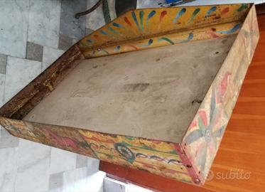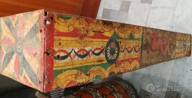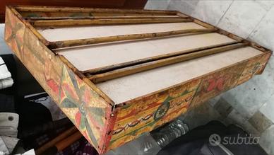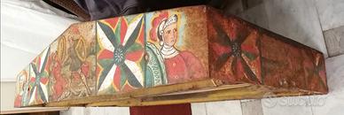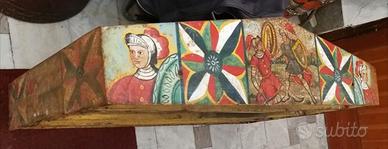 Comet da foto, probabilmente tolto da Ape Piaggio d epoca, possibili vari usi decorativi ed espositivi per negozi o ristorazione telaio in ferro, pannello in legno decorato con immagini tipiche della tradizione siciliana, vissuto con evidente patina del tempo, misure :85x52 il piano