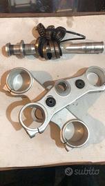 1 piastra superiore e inferiore con perno 28,8 mm e la filettatura di 26 mm 90 euro, montava su husqvarna 125. Una piastra di sterzo per moto 50 cc 50 euro cad. 1 kit di rialzi manubrio d.22 mm a 40 euro, 1 kit riser manubrio husqvarna125 30euro.