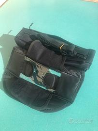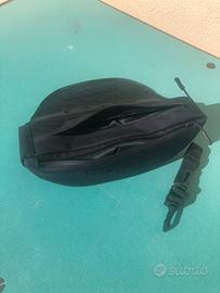 Borsello da manubrio nuovo, mai usato. Due spazi separati dotati di cerniere impermeabili , tasca trasparente per telefono , cinghia per trasporto con ganci , inserto per passaggio cavo auricolare e fascie per fissaggio a manubrio in robusto velcro.