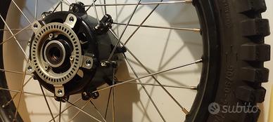 kit di conversione enduro per suzuki v-strom 650 anni dal 2017 al 2022, completo di cerchio con mozzo originale suzuki con ruota fonica inculsa, raggiato su canale da 21", e gomma enduro da 21" nuova mai usata. E' sufficente montare i due dischi freno non inclusi, ed è pronta.