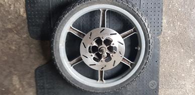 ruota anteriore liberty 50 del quattro tempi anno 2003 ma adatta anche per due tempi, revisionata, cuscinetti ok con grasso nuovo nelle sfere, diametro disco 3,4 millimetri con frena filetto sulle viti nuovo presente perno di lunghezza 20 centimetri diametro del perno 15 millimetri dado chiave da 18 anche ingresso cuscinetti 15 millimetri distanziale del perno 12,3 millimetri misure prese con il calibro digitale rinvio contachilometri rotto gomma da cambiare gonfia con camera ad aria ma si può utilizzare anche cosi dot gomma 05/03 numeri pneumatico 80/80-16 M/C 40J cerchio originale piaggio marca grimeca 6 razze raggi numero identificativo cerchio 16 ×1.60 DOT-D MADE IN ITALY spedizione disponibile
