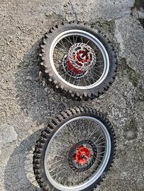 vendo per ktm 300 anni 90 ruote anteriore e posteriore complete di dischi corona perni a 100.€ piu ruota anteriore per yamaha xt 600 anni80 a 50 € solo sms no perditempo grazie