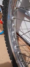 vendo ruote Yamaha XT550. Ruota anteriore molto bella, dritta ,raggi e cuscinetti perfetti, solo una piccola zona con qualche macchia(ancora con etichetta Yamaha) 70. Ruota posteriore non bella esteticamente ma perfetta. Cerchio dritto, tamburo non ovalizzato,raggi e cuscinetti buoni 40.