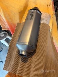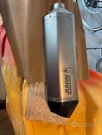 Lo scarico offre un notevole risparmio di peso a vantaggio delle prestazioni della moto. Il fondello d’uscita e la staffa di ancoraggio sono in carbonio. Lo scarico è dotato di dB-killer estraibile.