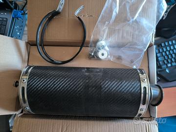 Lo scarico è stato smontato da una GSX-R 600 K4. Non presenta alcuna ammaccatura o altro, servirebbe solo una semplice lucidata al carbonio per farlo tornare a brillare.
