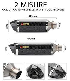 scarichi marmitta moto / maxi scooter sportivo silenziatori replica universale completo di dbkiller/adattatore collettore / molle / kit fascetta installazione DISPONIBILI 2 MISURE : 37cm (sia carbonio che nero opaco) 47cm (sia carbonio che nero opaco) nota: Differenze tra un silenziatore corto o lungo sui 4 tempi: Un silenziatore lungo, per esempio, offre una maggiore contropressione, il che può migliorare il tiro e l’erogazione della potenza a bassi regimi. adatto per i lunghi viaggi e un rumore più contenuto D’altra parte, un silenziatore corto tende a ridurre questa contropressione, potenzialmente aumentando le prestazioni ad alti regimi, ma a costo di una perdita di coppia a bassi giri. *maggiori prestazioni, estetica più accattivante ma un po più rumoroso se occorre anche il raccordo riduttore del collettore grande a piccolo da 38 a 50mm o da 32 a 50mm (solitamente serve per maxi scooter) chiedere prima tel 3398007236, ritiro di persona oppure posso spedire su pagamento anticipato (5 euro la spedizione)