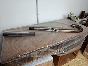 Vendesi doppio scarico completo composto da n.2 scarichi (uno per cilindro dx e sx) e n.2 terminali, completi di para-calore, come da foto. Gli scarichi sono artigianali realizzati su misura, mentre i terminali sono stati acquistati da catalogo CafèRace mod. Terminale cromato ROADHAWK 1960. Attacchi standard senza modifiche su modello BONNEVILLE. Il risultato del montaggio è visibile in foto. Ottimo sound e risultato estetico.