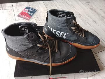 La scarpa AS-DSL Akio della collezione Alpinestars x Diesel è una scarpa da guida protettiva per moto che può essere indossata casualmente dalla bici per attività urbane off-bike.