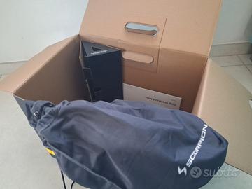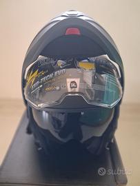 Casco nuovo come da negozio con scatola e corredo completo,con sacca e visiera come da foto,colore Matt Black Silver Taglia XXXL 64 -65 CM EXO-TECH EVO PRO è il nuovo casco modulare di Scorpion dallo stile distintivo e adatto ad alte prestazioni. La calotta esterna, a basso volume, è realizzata in fibra TCT Ultra ed è quindi resistente e allo stesso tempo super leggera. Il meccanismo della mentoniera (apribile a 180°) è semplice da usare rendendo il casco estremamente pratico in ogni occasione. Inoltre, il casco presenta una presa d'aria superiore che garantisce un'alta ventilazione e interni interamente estraibili, lavabili morbidi e traspiranti per un eccellente comfort. CARATTERISTICHE TECNICHE: - Calotta esterna in Fibra TCT Ultra (Thermodynamic Composite Technology) - Doppia omologazione P/J - Chiusura del sottogola con fibbia micrometrica - Apertura della mentoniera a 180° Flip-Back - Visiera (KDF-18) Trasparente con predisposizione Pinlock - Visiera interna solare retraibile UV400 e con trattamento antiappannamento EverClear - Sistema Ellip-Tec per un cambio rapido della visiera - 2 aerazioni indicizzate regolabili indipendentemente - Tessuto Kwikwick3® assorbente, traspirante morbido al tatto e ipoallergenico - Interno completamente estraibile e lavabile - KwikFit: Cuscinetti interni che consentono l'inserimento facilitato delle asticelle degli occhiali più comuni - Predisposto per l'installazione di un sistema di comunicazione Bluetooth aftermarket - Paranaso removibile