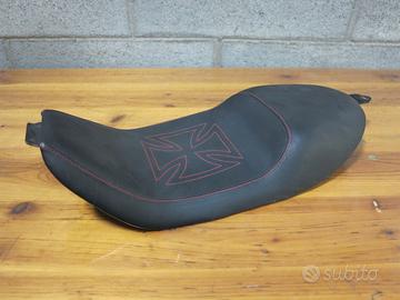 Sella aftermarket con telaio rigido, con cucitura rossa a croce. In buone condizioni.