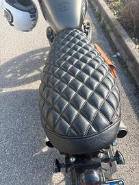 Sella Motone in pelle nero con motivo a rombi. Bello e comoda per conferire alla tua moto un look cafe racer o brat. Montata su una street twin 900 della triumph. Per vedere altre compatibilita cercate su internet.
