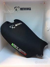 Sella pilota adatta per Panigale V4 tutte le versioni. Sella in neoprene (più alta nella parte centrale, rispetto all'originale, di 3 cm) con ricami M.MOTOCORSA di colore bianco nella parte centrale e ricami RACE SEATS tricolore sui laterali. Fondo in VTR.