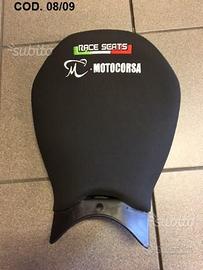 COD.06: sella in neoprene modello basso (-4 cm rispetto all'originale) con fondo in vetroresina e ricami M.Motocorsa bianco e Race Seats tricolore - Euro 230,00 .
