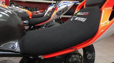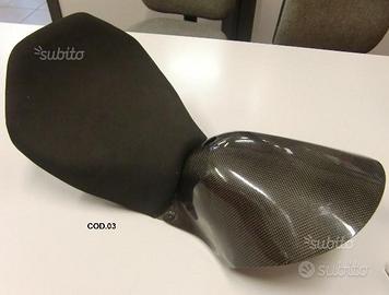 COD.04: sella in neoprene con fondo in carbonio e ricami M.Motocorsa bianco e Race Seats tricolore (+4 cm rispetto all'originale) - Euro 355,00 ;