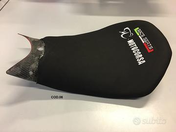 COD.04: sella in neoprene con fondo in carbonio e ricami M.Motocorsa bianco e Race Seats tricolore (+4 cm rispetto all'originale) - Euro 355,00 ;