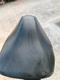 sella Yamaha Aerox con leggeri spruzzi di bomboletta blu sopra e un graffio.