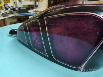 Verniciatura professionale Metal Flake viola/nero con dettagli grafici custom di alta qualità, effetto brillante e profondo.
