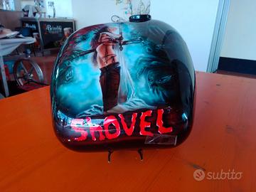 Il serbatoio ha lievissime ammaccature, è aerografato ma a causa di segni superficiali è da riverniciare. Valido sia x preparazioni Harley-Davidson che per progetti special custom chopper bobber Honda Kawasaki Yamaha Suzuki Moto Guzzi ecc. Canale inferiore larghezza variabile da 4,5 a 6cm. Altri dettagli e foto a semplice richiesta. Posso spedire. €85+spediz. €12