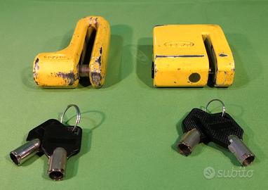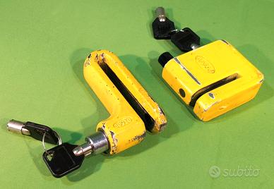Set 2 bloccadisco freno per moto/scooter/bici elettrica. Usati con graffi d’uso ma con sistemi di chiusura perfettamente funzionanti, no ruggine, ognuno con rispettive n.2 chiavi numerate.