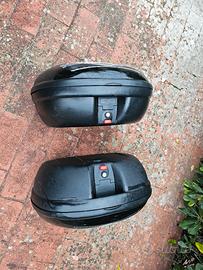 Set bauli Kappa per moto 52L il posteriore + coppia 40L laterali. Le staffe sono per Suzuki GSX1250FA, ma vendo anche i baulisenza staffe. Gli agganci sono standard kappa Monokey e la piastra givi del bauletto posteriore è potenzialmente riadattabile a ogni moto. Disponibile a spedire ma mettendoci prima d'accordo per le spese. Sui laterali ci sono i segni di nastro isolante che ho rimosso, servivano a tenere il logo argentato che si sta sollevando senza però inficiare la funzionalità. Hanno i segni del tempo ma funzionano perfettamente.