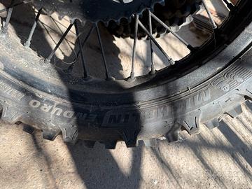 Vendo paio di gomme con cerchioni, praticamente nuovi, gomme da cross michelin, insieme cedo anche già montato la corona, dischi freni, con pinze e pastiglie, tutto funzionante con anche le forcella davanti,tutto già montato