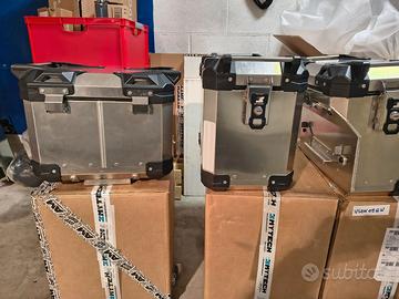 Set acquistato a luglio 2025 composto da: top case 44l, valigia Sx da 48l, valigia dx scaricata da 41l. Le valigie si aprono tutte con un'unica chiave e sono adatte a qualsiasi moto con scarico a dx ed utilizzano il telaio e la piastra specifici prodotti da Mytech. Il tutto è stato utilizzato per un unico viaggio di tre settimane lo scorso agosto.