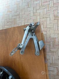 Telaio con forcellone targato 2001 con regolari documenti - 150e + pass Pedane complete 75e cad Valvola rave pneumatica 100e Accensione rotore interno completa di bobina e centralina 150e Basamento motore buono con 3 uscite a varano stagione 2025 300e Impianto frenante ant radiale completo mod 2006 150e Impianto frenante post mod 2006 100e Sella 2005 50e Telaietto anteriore 25e Carene e cerchi venduti Forcelle e mono venduti Chiedete per altri componenti non in elenco