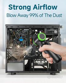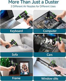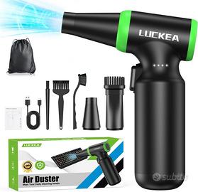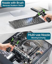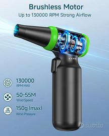 130000 giri/min Elettrico Rimuovi Polvere Aria Compressa Spray per PC - 3 Velocità Soffiatore ad Aria Compressa, Batteria da 6000 mAh, Kit Pulizia PC con 2 Ugelli e 3 Spazzole, Air Duster Pulizia completa in appena 1 minuto - Dotato di un motore brushless migliorato, il rimuovi polvere aria compressa elettrico vanta una velocità massima dell'aria di 130000 giri/min, 150 g di pressione dell'aria e una velocità massima del vento superiore a 55 m/s, superando la potenza degli aria compressa spray o bomboletta aria compressa. Questo mini soffiatore portatile per polvere rimuove senza sforzo polvere e detriti intrappolati da PC, console e TV. Air duster multifunzionale - Il aria compressa elettrico per polvere offre 3 impostazioni di velocità: 6000 giri/min, 9000 giri/min e 130000 giri/min. Può essere utilizzato non solo per la pulizia di dispositivi elettronici come tastiere di computer e fotocamere, ma anche per la pulizia delle auto, soffiando foglie, rimuovendo ragnatele, ecc. Oltre alla sua funzione di soffiaggio, il mini soffiatore a batteria può anche gonfiare materassi ad aria e salvagenti. Batteria grande da 6000 mAh e ricarica rapida di tipo C: il soffiatore aria compressa per la polvere è alimentato da una batteria da 6000 mAh e fornisce fino a 75 minuti di lavoro continuo alla velocità più bassa. Con una porta di ricarica di tipo C, il mini soffiatore a batteria può essere completamente caricato in sole 3 ore. La batteria del aria compressa elettrico per la polvere è dotata di protezione da sovratemperatura, sovracorrente e cortocircuito. Kit spazzola antistatica: questo aria compressa elettrico per la polvere elettrico include 2 ugelli e 3 spazzole antistatiche. Queste spazzole, realizzate in termoplastica di alta qualità, sono perfette per affrontare macchie ostinate e polvere sui dispositivi e sono sicure per i dispositivi elettronici sensibili all'elettricità statica. Dopo la pulizia, tutti gli accessori possono essere riposti nella borsa di stoffa in dot
