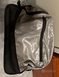 Borsa da moto grande, con tre serie di cinghie per allacciarla al portapacchi/sella e cinghia da trasporto come borsone.