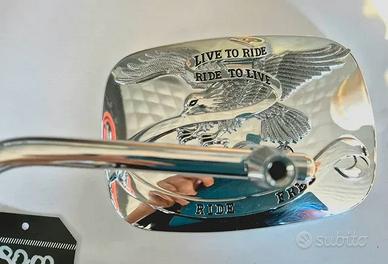 Coppia di specchietti cromati custom per Harley-Davidson. Fregi "Live To Ride" in rilievo. Adatti a Harley Road King dal 1996 al 2006
