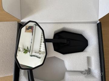 Coppia di specchietti per moto omologati con marchio E, perfettamente conformi alle normative europee per l’utilizzo su strada pubblica. Questi specchietti fondono sicurezza e stile grazie a un design moderno con finitura nera opaca sabbiata, sobria ed elegante, capace di adattarsi a diversi stili di moto. Il corpo è realizzato in robusto alluminio, garantendo una struttura stabile e un'immagine chiara e priva di vibrazioni anche durante la marcia. La superficie specchiante di grandi dimensioni (86 x 128 mm) assicura un campo visivo ampio per una guida sicura. La versatilità è il punto di forza: grazie allo snodo con rotazione a 360°, lo specchio può essere regolato con precisione millimetrica in base alla posizione di guida e alla larghezza del manubrio. La compatibilità è estesa a diverse configurazioni, inclusi manubri con foro filettato M8 e manubri con diametro interno compreso tra 13–15 mm oppure 17–19 mm (si prega di notare che non sono compatibili con diametri interni da 15–17 mm). L'installazione è intuitiva e permette un fissaggio solido, ideale per chi cerca un componente affidabile che migliori l'estetica del proprio mezzo senza rinunciare alla legalità e alla funzionalità. Un accessorio tecnico di alta qualità, perfetto per personalizzare la tua moto con un tocco professionale e resistente nel tempo.