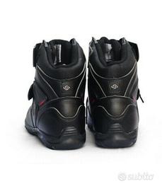Scarpe con doppia chiusura a strappo più quella a lacci colore nero, professionali, altissima qualità, con protezioni e rinforzi per la leva del cambio e caviglie