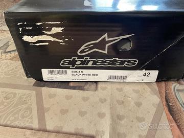 Vendo stivaletti da moto Alpinestar taglia 42 nero rosso e bianco, comodi e leggeri (sembrano stivaletti da sera) usati ma ancora in ottimo stato. Facili da indossare e da togliere; in punta a contatto con il cambio non danno fastidio, buona sensibilità. Segni di usura visibili sopratutto sul tallone (bianco). Vendo per inutilizzo.