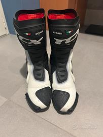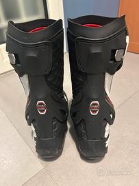 Stivali racing in buone condizioni, piccoli segni dovuti ad una leggera scivolata sullo stivale destro, che non pregiudicano la funzionalità e la sicurezza.