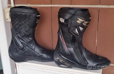 Stivali da moto TCX TR-Race WP (Watherproof-Impermeabili); Tg. 43; cerniera zip con protezione interna ed esterna in pelle; chiusura millimetrata da leva in alluminio; colo del piede con strato morbido per miglior flessione della caviglia.