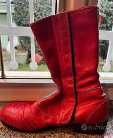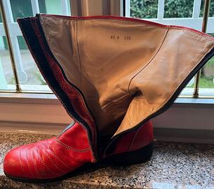 Stivali da moto vintage Gaerne storica azienda italiana in pelle di alta qualità e suola in gomma resistente. Chiusura laterale con cerniera ptotetta da una patta in pelle.