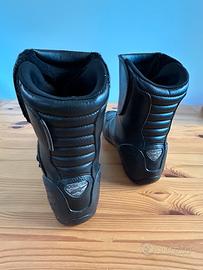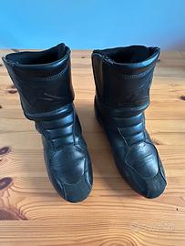 Taglia 43 a pianta larga, in pelle con rinforzi su caviglia, tibia e punta.
