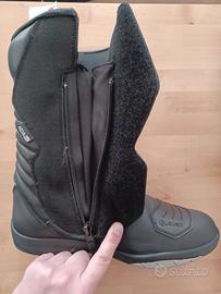 comfort, protezione, sicurezza, stabilità, grip: ottimi stivali comodi e caldi per viaggi in moto o spostamenti im scooter in città per chi usa le 2 ruote tutto l'anno. Impermeabili riparano da pioggia, freddo e vento. Non si perde la sensibilità del piede, anzi grazie alla combinazione di parti rigide e morbide si ha stabilità e movimento del piede e la suola antiscivolo fa il suo lavoro su qualsiasi terreno e condizione meteo. Li vendo perché non ho più lo scooter. Hanno la loro scatola originale e odorano ancora di pelle nuova. Usati pochissimo, praticamente nuovi. Prezzo da saldi veri.