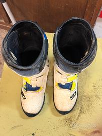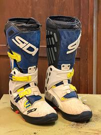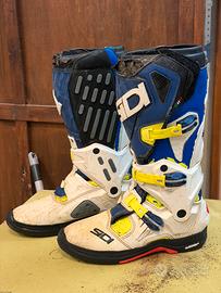 Vendo stivale moto Sidi Atojo, colori come da foto, con personalizzazione con vernice azzurra di alcune parti degli stivali (in stato di usura). Le parti usurate sono ben visibili nelle foto, che cmq rimane utilizzabile in tutte le condiIoni. Misura 43, da poco risuolate (2 uscite all’attivo).