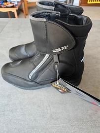 Stivaletti moto donna sotto al polpaccio con chiusura a zip e velcro e protezione per leva del cambio. Nuovi mai indossati ma senza scatola (motivo per cui li avevamo proprio dimenticati nell'armadio 😅 ), devono solo prendere aria. Come si vede delle foto non ha graffi ma l'unica pecca e che, siccome non è stato né usato né trattato con prodotti specifici, il rinforzo della cucitura superiore si è sfaldato e qualche micro pezzetto è caduto all'interno della scarpa ma null'altro.