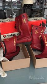 Solo per amanti del vintage e delle moto classiche, perfetta coppia di stivali Vendramini uomo/donna, tg. 42 e 36, anno 1982, rossi, Uomo usati 3 / 4 volte per set fotografici, Donna MAI INDOSSATO. Vendesi preferibilmente in coppia, 80,00 € cadauno, quindi 160,00 €.