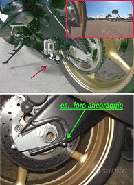 Supporto per videocamere GoPro (TUTTI i modelli) adatto al fissaggio sul Cruscotto di Moto Stradale, (nelle foto: YAMAHA R6 2013), o comunque utilizzabile in QUALSIASI moto che abbia il foro del canotto forcella libero, (il perno viene realizzato su misura in base alle dimensioni del foro posseduto).