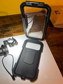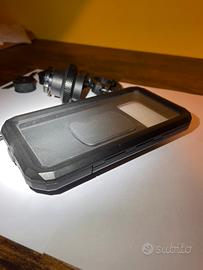 Come nuovo, ha un morsetto che si aggancia al manubrio o allo specchietto della moto. È dotato anche di ammortizzatore delle vibrazioni, per non rovinare il telefono. La custodia che contiene il telefono è resistente alla pioggia.